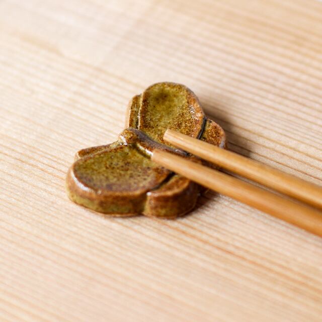 信楽焼の陶器でできた、箸置きです。 細かい造形と、ナチュラルな風合いが魅力です。 ご注文の際、ご希望のカラー番号をお選びください。 写真はサンプルです。 一つ一つ手作りのため、風合いや色み、釉薬の雰囲気が異なります。 価格は一個の価格です。 サイズ:約40x30x6mm